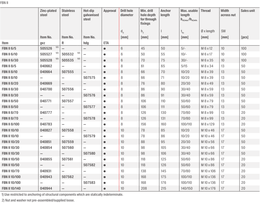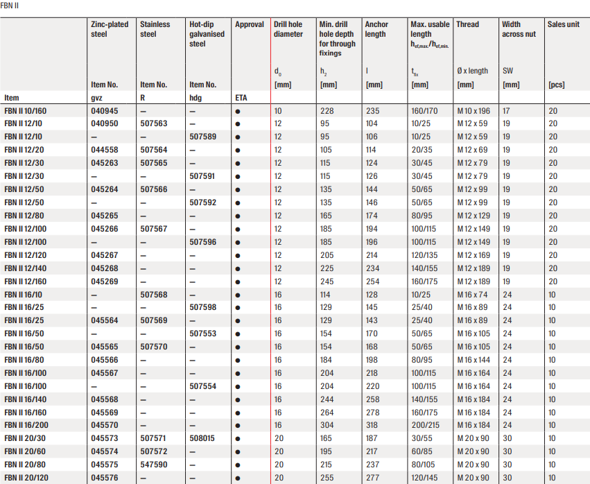 Der fischer Bolzenanker FBN II ist ein Stahlanker für wirtschaftliche Befestigungen in ungerissenem Beton. Dank des langen Gewindes und der zwei Verankerungstiefen ist der fischer Bolzenanker FBN II besonders flexibel einzusetzen. Neben der Vorsteck- und der Durchsteckmontage ist der Bolzenanker auch für die Abstandsmontage geeignet. In der Ausführung aus nicht rostendem Stahl ist der Bolzenanker für Fassadenunterkonstruktionen, Konsolen und Leitern im Außenbereich geeignet.